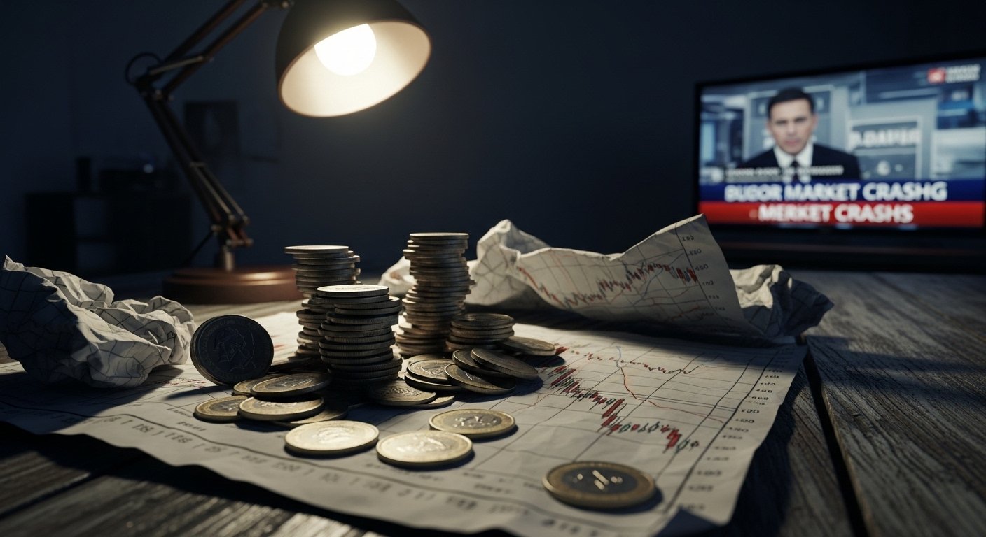 cinematic, high detail, dramatic lighting, realistic coins and charts, tense atmosphere, financial crisis theme.
